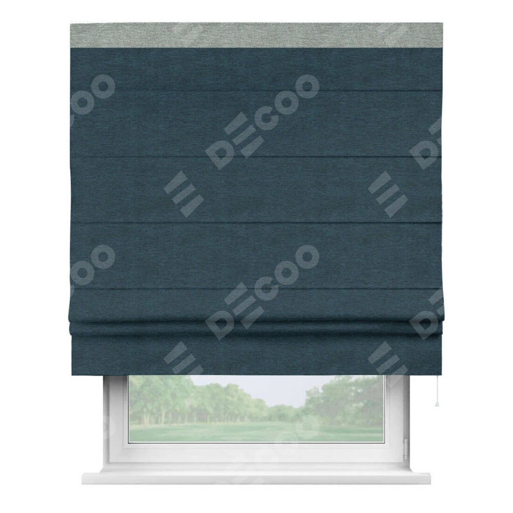 Римская штора производителя «Cortin», используется для проёма, пошита из ткани твид блэкаут глубокий синий, артикул 21590. Отделка шторы кантом «Кинг», ткань для канта используется из твида разной расцветки на выбор. Имеет универсальный механизм и подходит для монтажа: на потолок, на стену и в нишу.