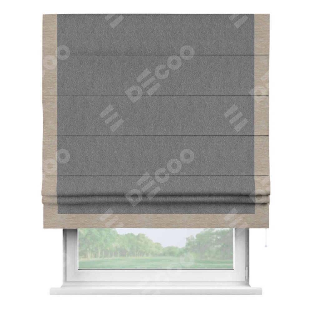 Римская штора производителя «Cortin», используется для проёма, пошита из ткани софт однотонный серый, артикул 70605. Отделка шторы кантом «Виктория», ткань для канта используется из софта разной расцветки на выбор. Имеет универсальный механизм и подходит для монтажа: на потолок, на стену и в нишу.