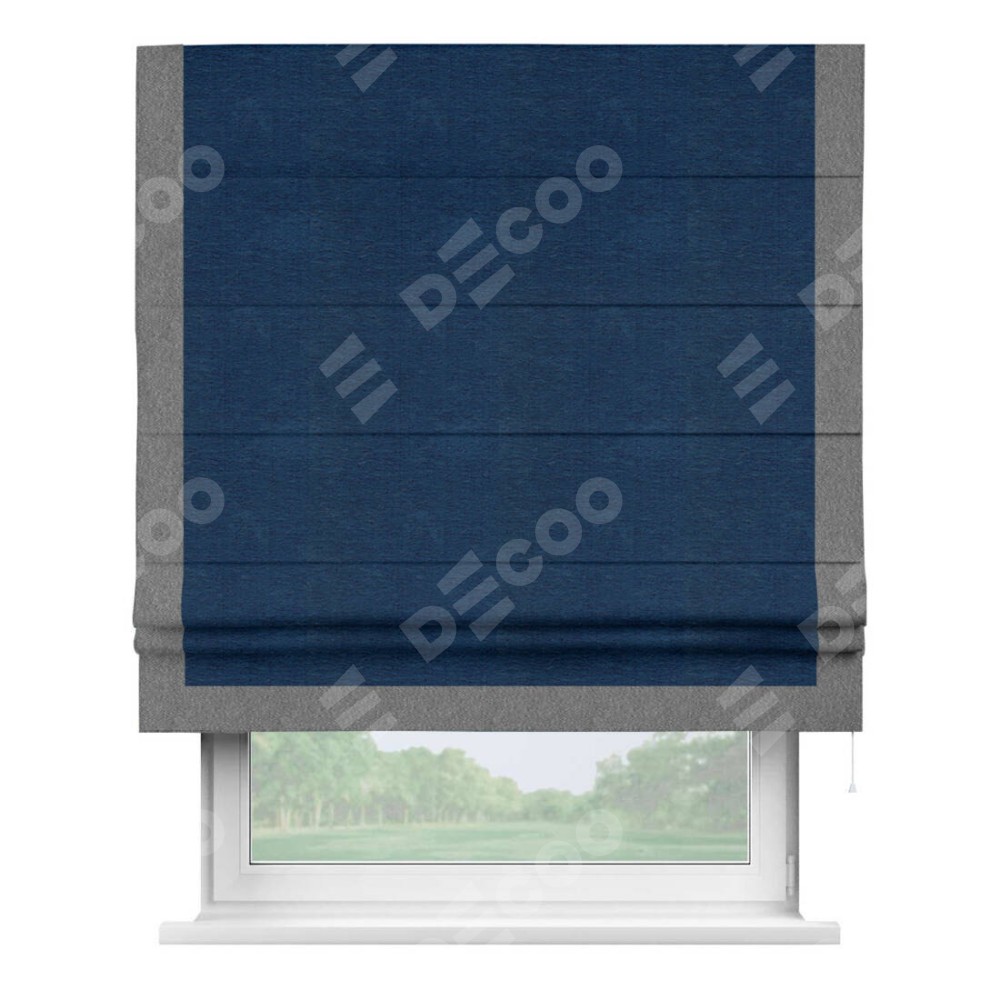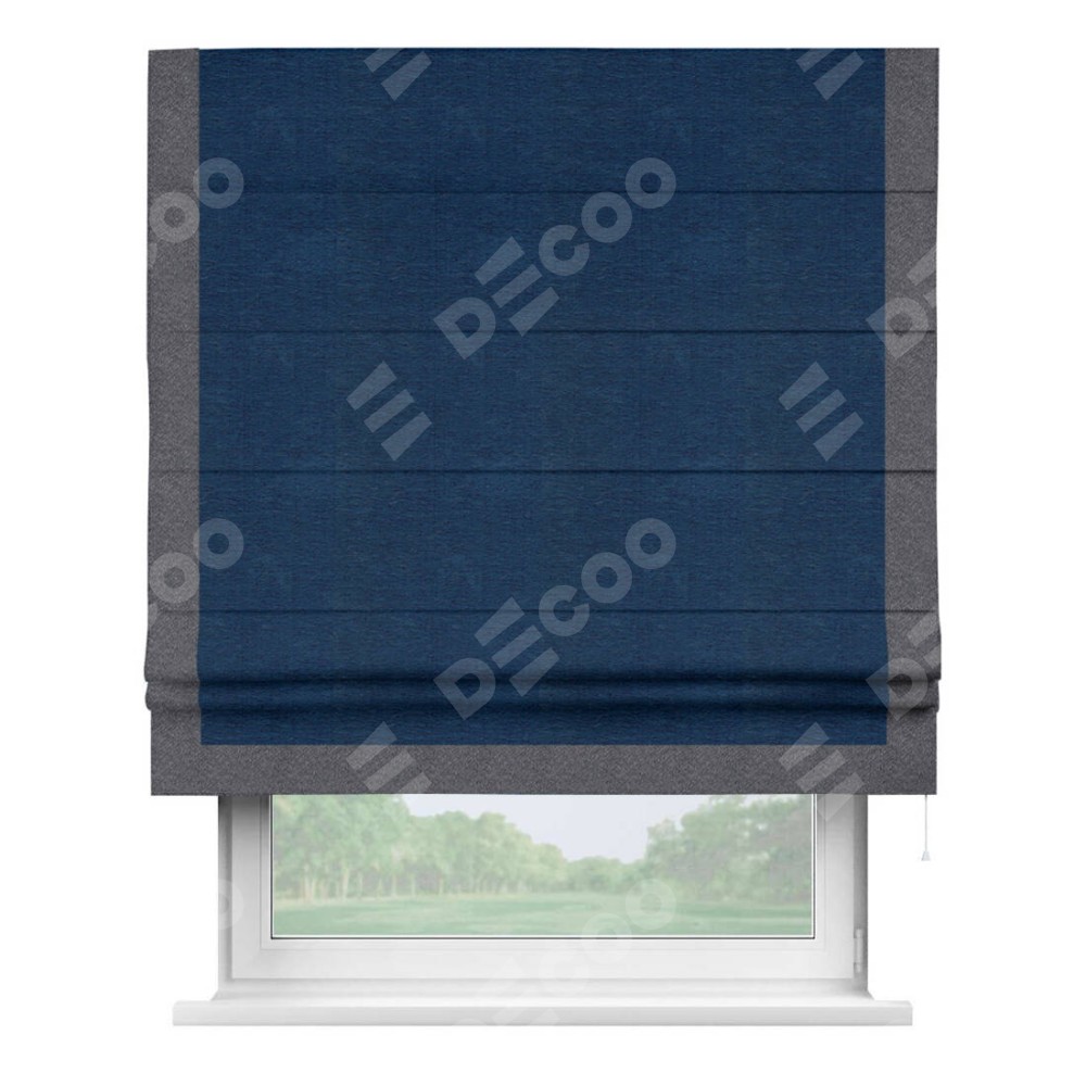 Римская штора производителя «Cortin», используется для проёма, пошита из ткани софт однотонный синий, артикул 42937. Отделка шторы кантом «Виктория», ткань для канта используется из софта разной расцветки на выбор. Имеет универсальный механизм и подходит для монтажа: на потолок, на стену и в нишу.