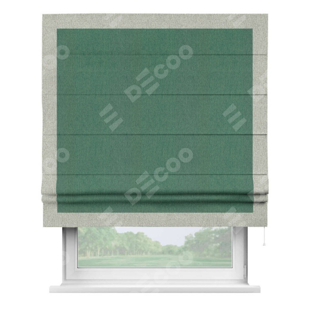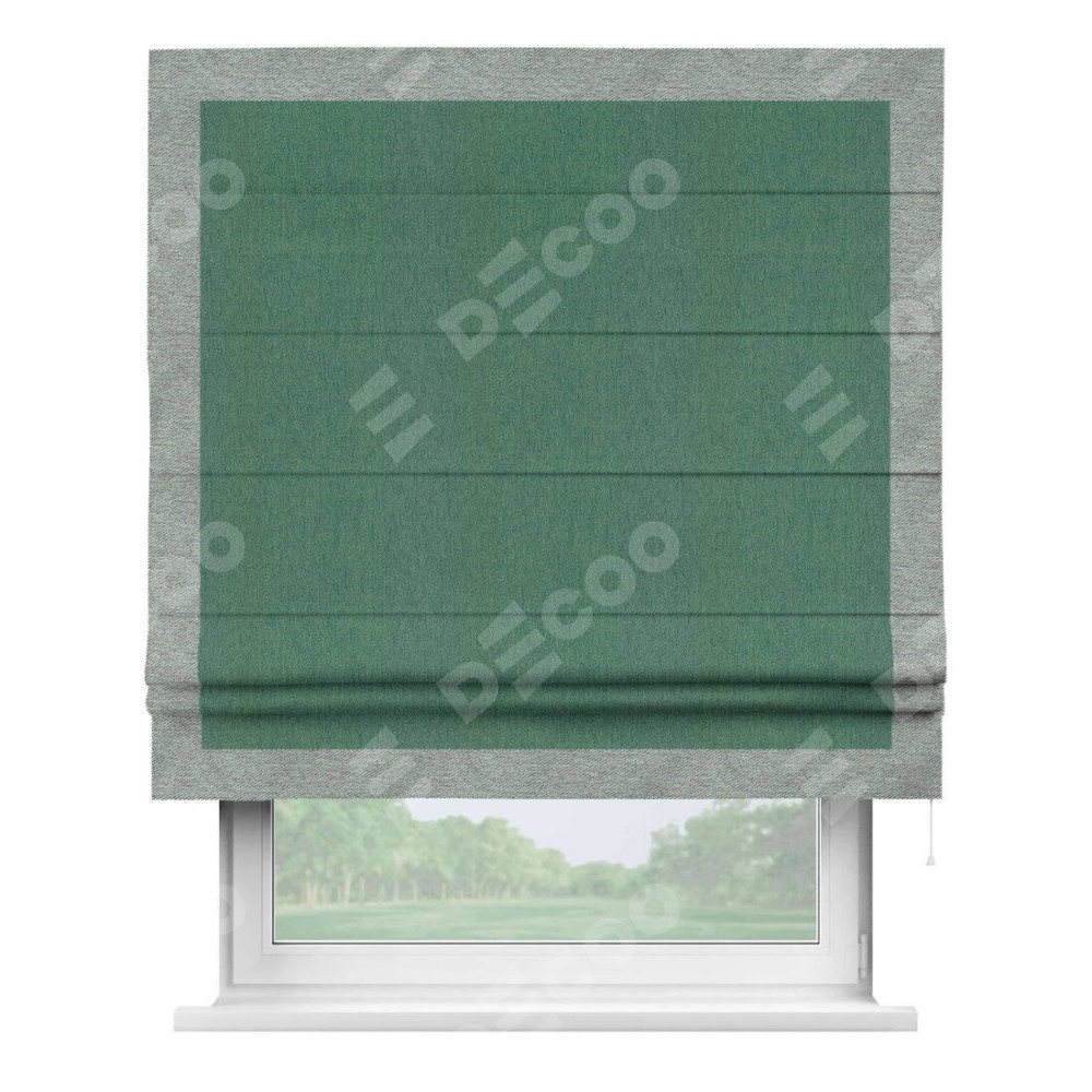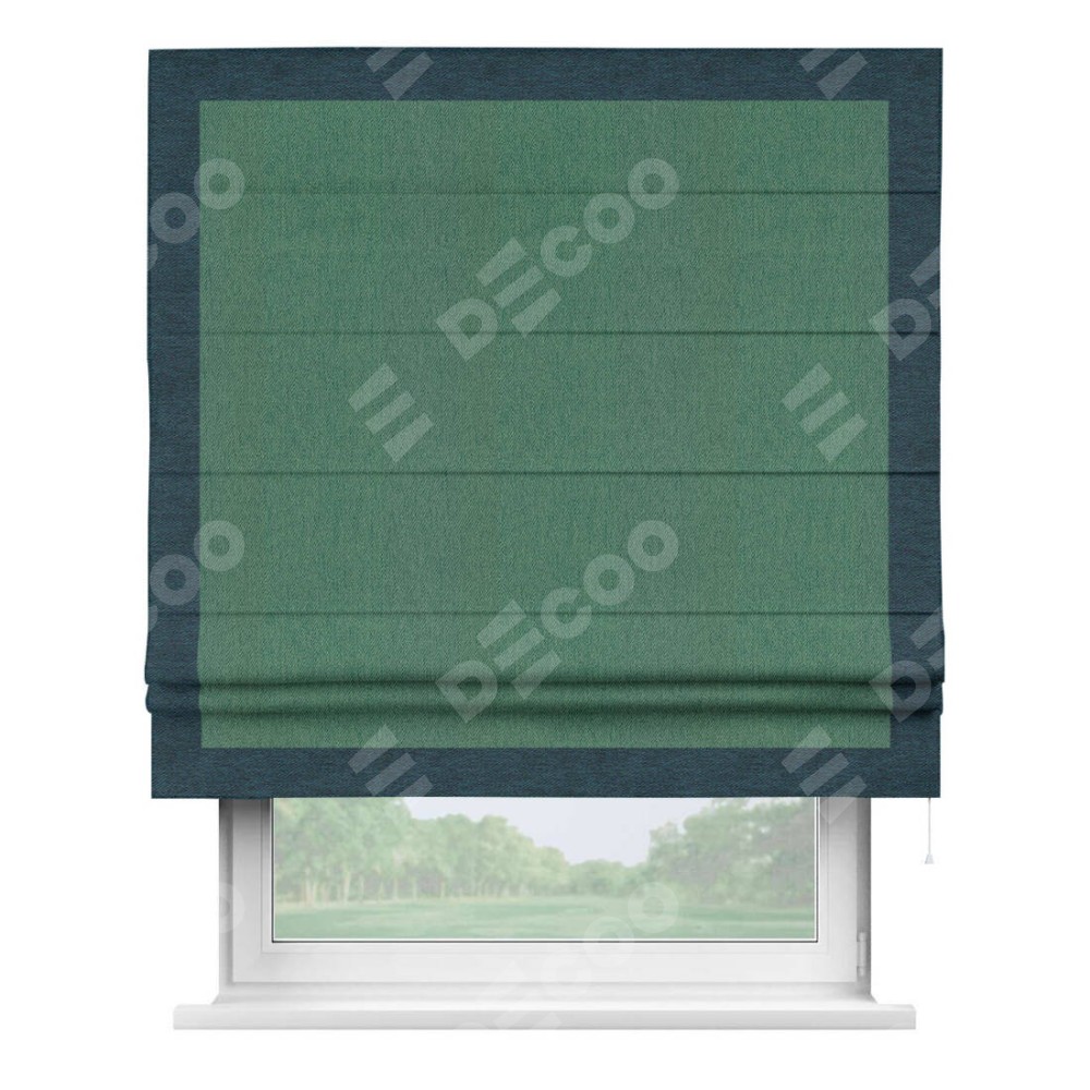 Римская штора производителя «Cortin», используется для проёма, пошита из ткани твид блэкаут зелёный, артикул 21589. Отделка шторы кантом «Чесс», ткань для канта используется из твида разной расцветки на выбор. Имеет универсальный механизм и подходит для монтажа: на потолок, на стену и в нишу.
