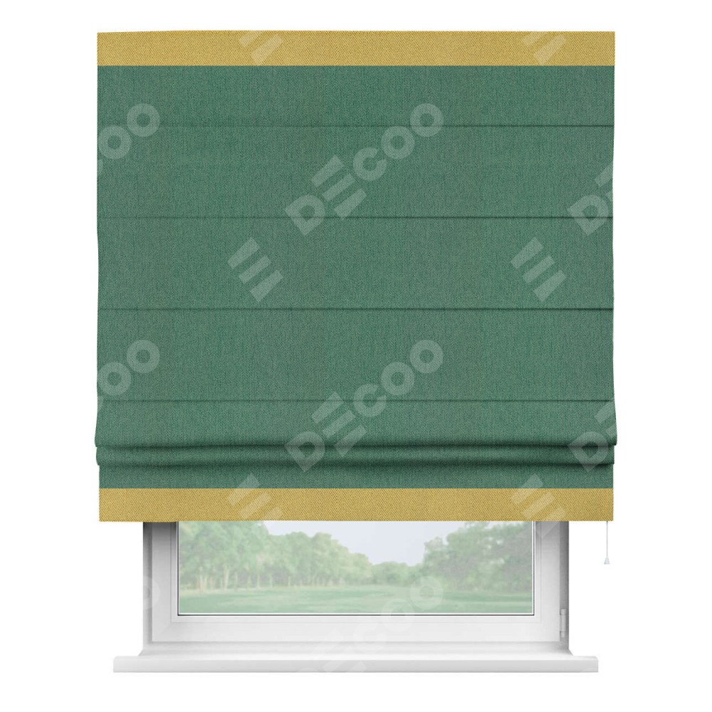 Римская штора производителя «Cortin», используется для проёма, пошита из ткани твид блэкаут зелёный, артикул 21589. Отделка шторы кантом «Горизонт», ткань для канта используется из твида разной расцветки на выбор. Имеет универсальный механизм и подходит для монтажа: на потолок, на стену и в нишу.