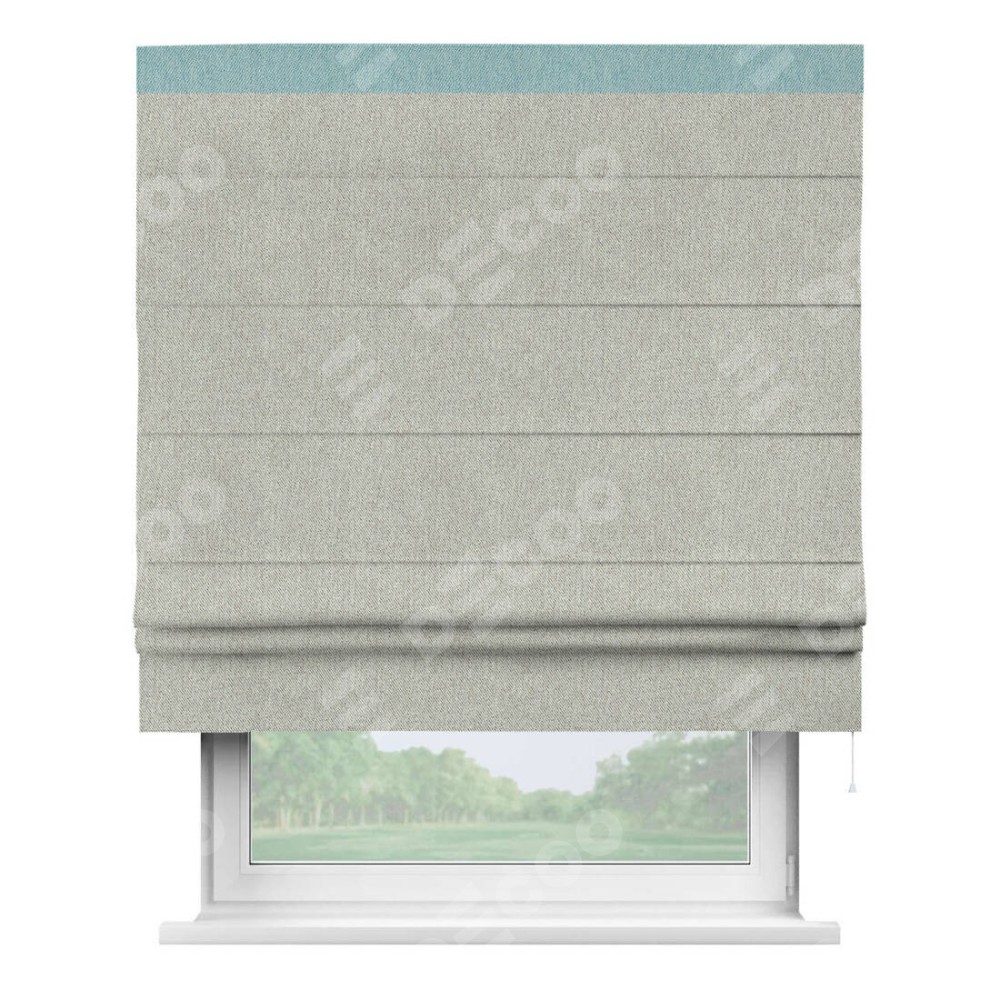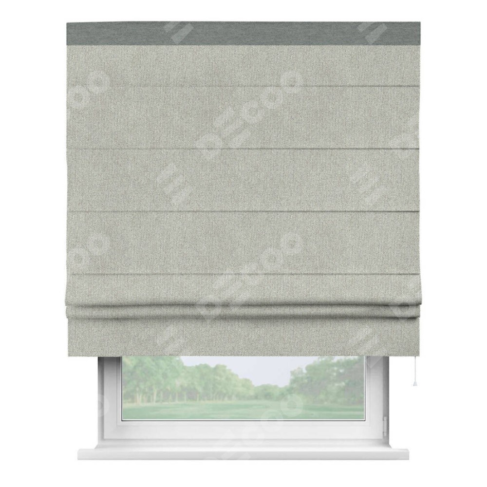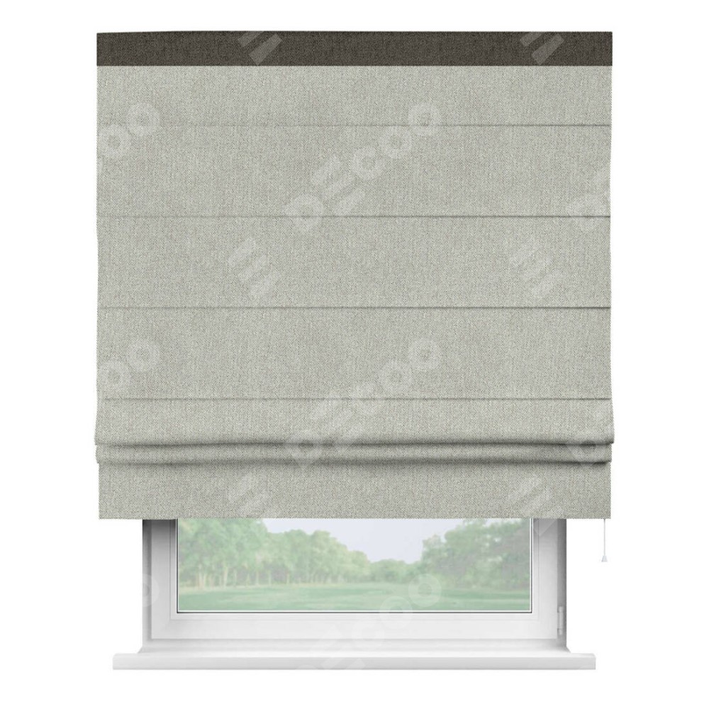 Римская штора производителя «Cortin», используется для проёма, пошита из ткани твид блэкаут коричнево-серый, артикул 21574. Отделка шторы кантом «Кинг», ткань для канта используется из твида разной расцветки на выбор. Имеет универсальный механизм и подходит для монтажа: на потолок, на стену и в нишу.