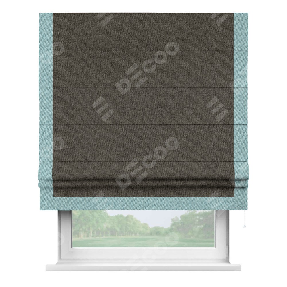 Римская штора производителя «Cortin», используется для проёма, пошита из ткани твид блэкаут тёмно-коричневый, артикул 21584. Отделка шторы кантом «Виктория», ткань для канта используется из твида разной расцветки на выбор. Имеет универсальный механизм и подходит для монтажа: на потолок, на стену и в нишу.