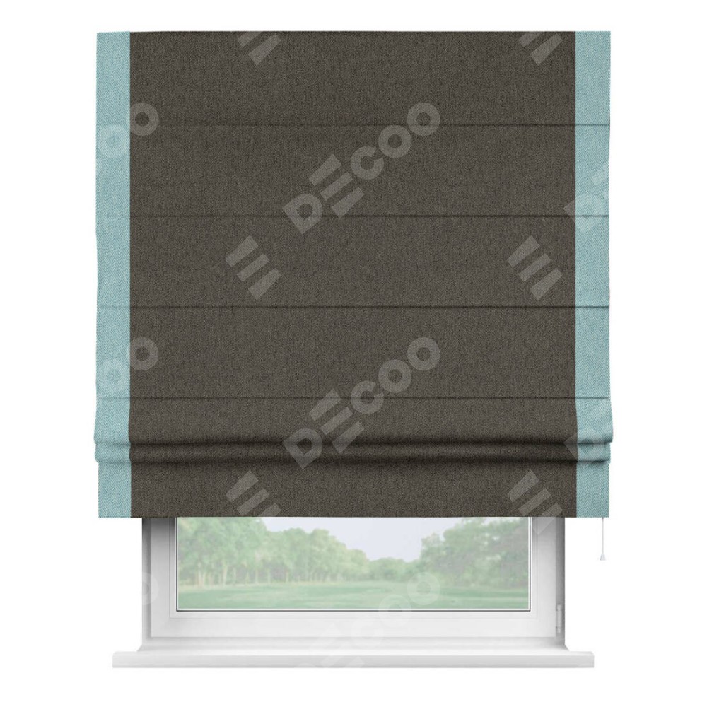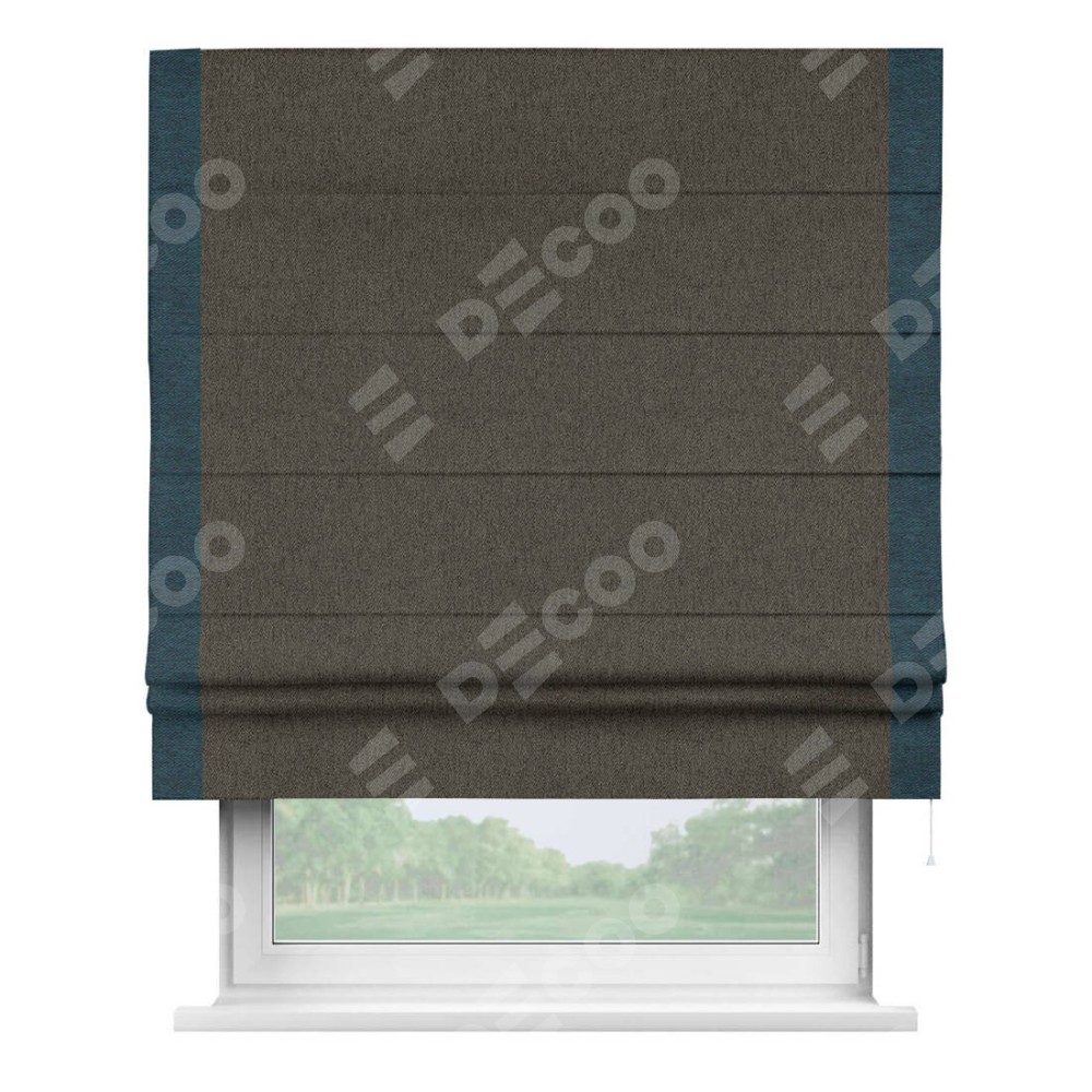 Римская штора производителя «Cortin», используется для проёма, пошита из ткани твид блэкаут тёмно-коричневый, артикул 21584. Отделка шторы кантом «Стрим Дуо», ткань для канта используется из твида разной расцветки на выбор. Имеет универсальный механизм и подходит для монтажа: на потолок, на стену и в нишу.