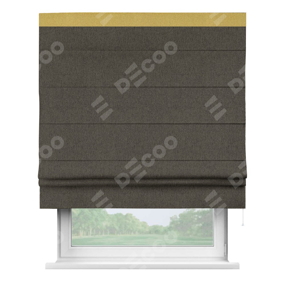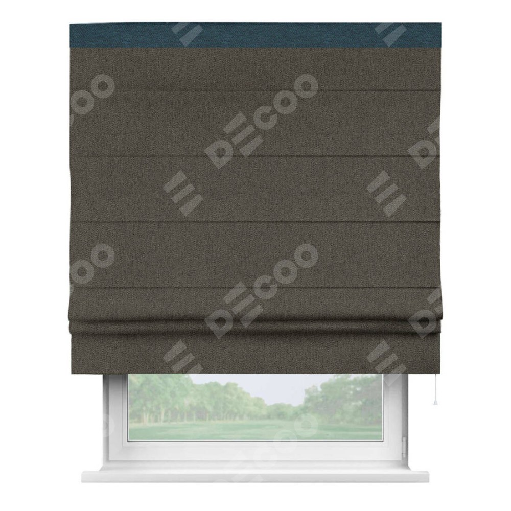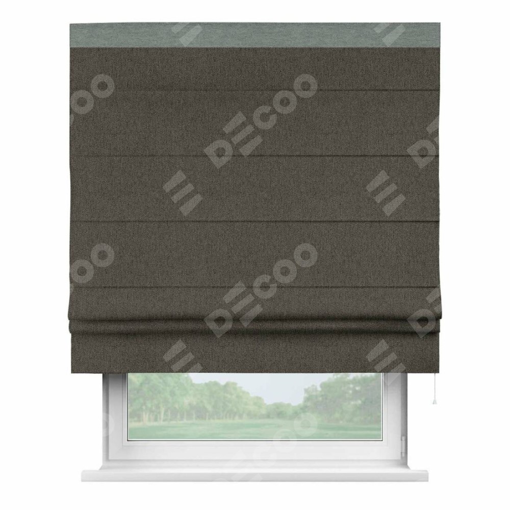 Римская штора производителя «Cortin», используется для проёма, пошита из ткани твид блэкаут тёмно-коричневый, артикул 21584. Отделка шторы кантом «Кинг», ткань для канта используется из твида разной расцветки на выбор. Имеет универсальный механизм и подходит для монтажа: на потолок, на стену и в нишу.