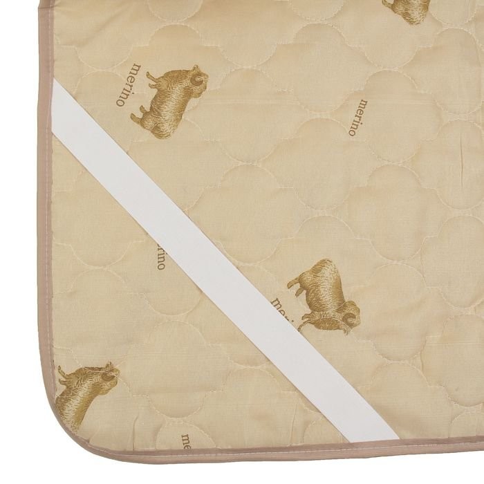 Чехол наматрасника выполнен из полиэстера светло-бежевого цвета.