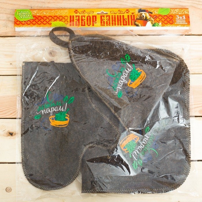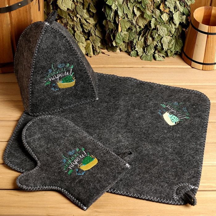 Для комфортного отдыха в парной возьмите с собой набор банных принадлежностей. Предметы из этого комплекта предохраняют тело от перегрева и являются средствами индивидуального пользования. Влажные изделия рекомендуется сушить в расправленном виде на горизонтальной поверхности. Принадлежности из войлока и фетра стирайте вручную при температуре воды 30 °C.