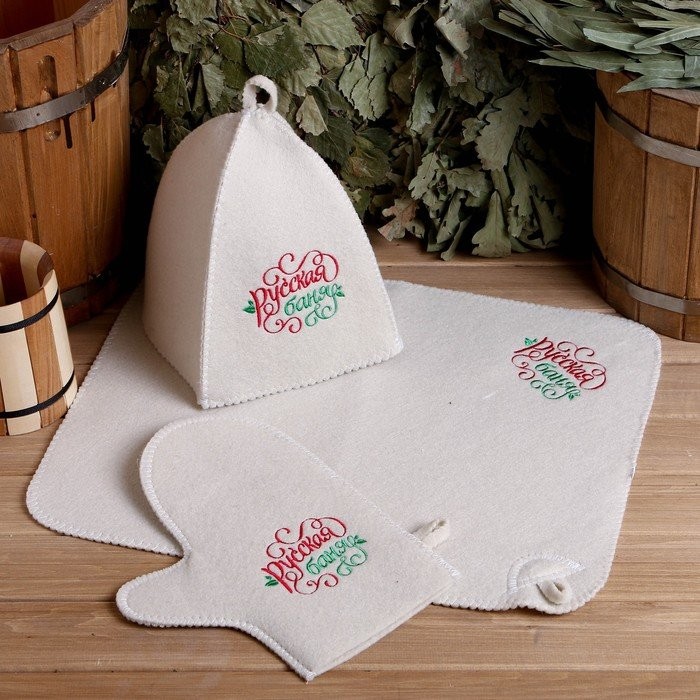 Для комфортного отдыха в парной возьмите с собой набор банных принадлежностей. Предметы из этого комплекта предохраняют тело от перегрева и являются средствами индивидуального пользования. Влажные изделия рекомендуется сушить в расправленном виде на горизонтальной поверхности. Принадлежности из войлока и фетра стирайте вручную при температуре воды 30 °C.