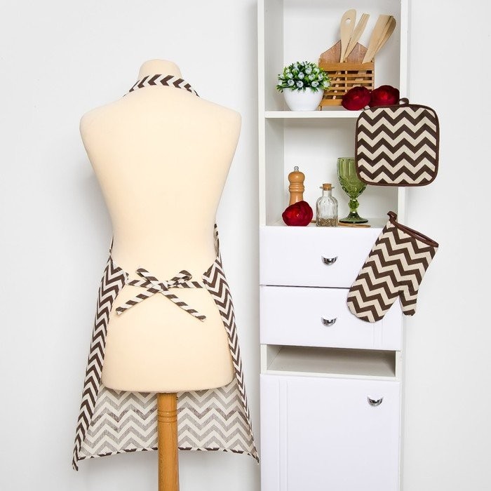 Набор Доляна фартук/прихватка/варежка, Зигзаг коричневый, 100%пэ, рогожка 200 гр/м