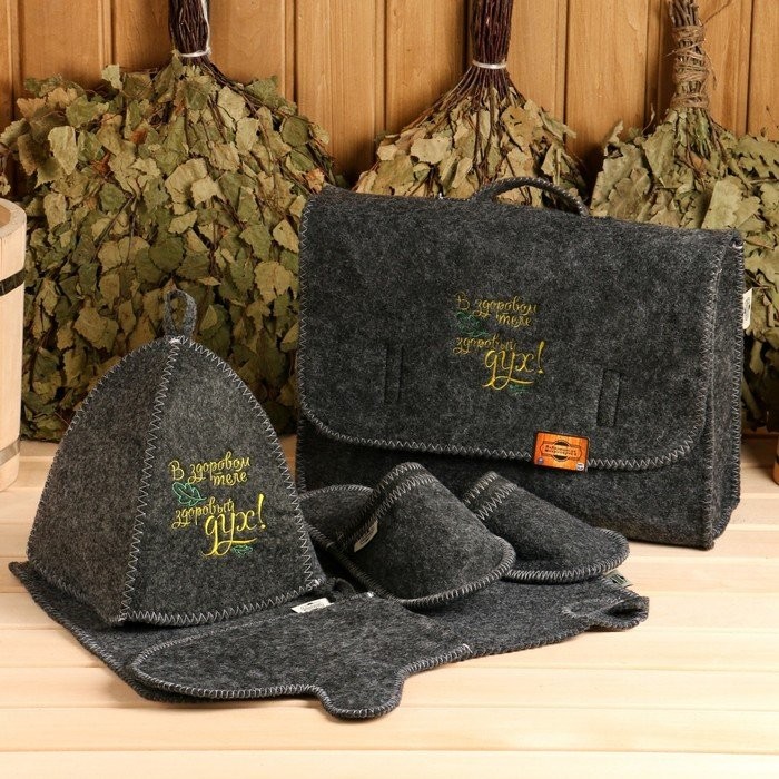 В портфеле можно хранить банные принадлежности и средства личной гигиены. Банная шапка защитит голову от перегрева, волосы от ломкости, а рукавица — от случайных ожогов.