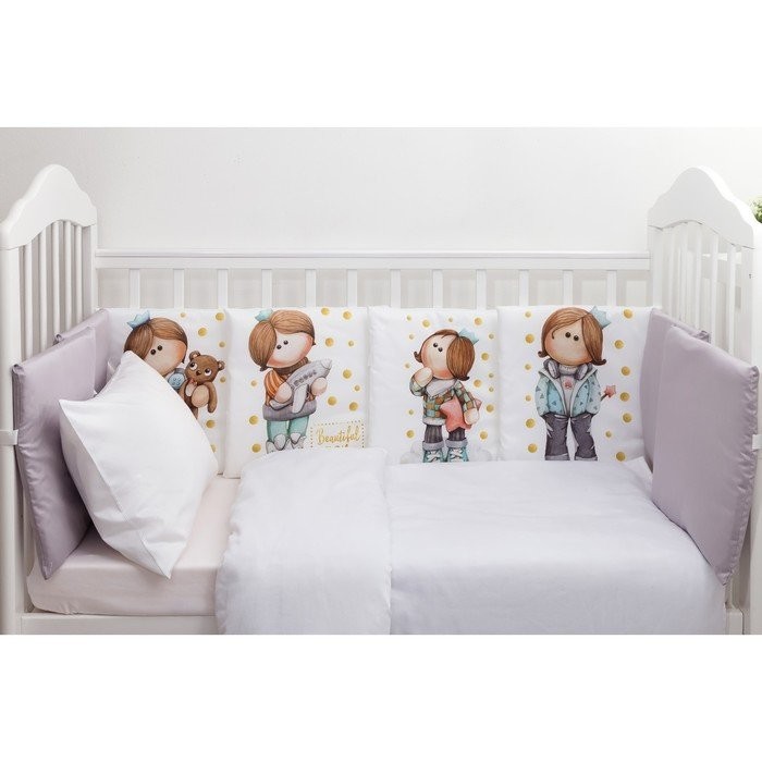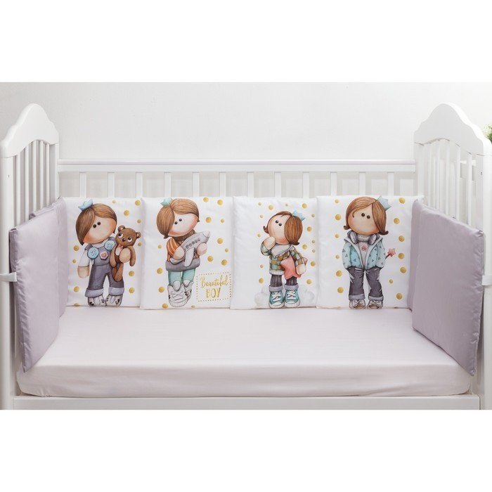 Бортики в кроватку Крошка Я «Принц Тим», цвет белый/серый, 35×35 см-8 шт, сатин