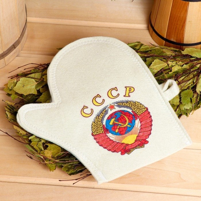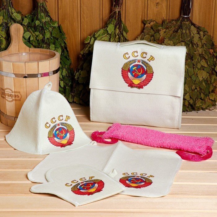 Набор для бани и сауны 5 в 1(сумка,шапка,варежка,коврик,мочалка),с принтом «СССР», белый